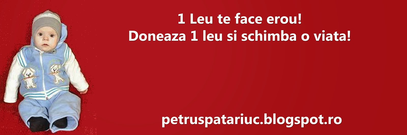 Ganditi-va cat inseamna 1 LEU pentru voi? Mai nimic… Probabil ca nici nu va mai amintiti ce v-ati cumparat ultima data cu 1 LEU. Poate ca v-ati luat o paine, un covrig sau o bomboana. Dar, pentru Petru cel Mic, 1 LEU inseamna o sansa la viata. Daca 27.112 de oameni doneaza cate 1 LEU, Petru cel Mic poate sa faca interventia chirugicala care ii ofera sansa la VIATA.