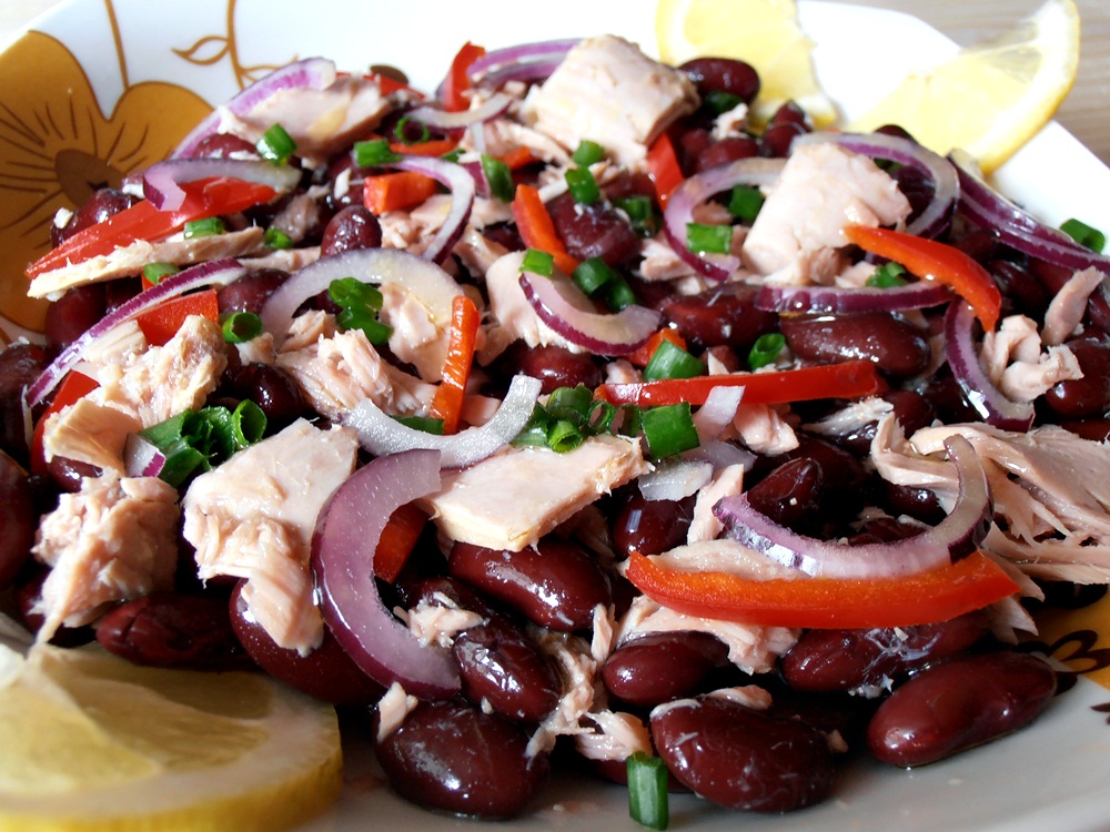 Punem in bolul de salata fasolea rosie la conserva spalata in doua trei ape. Adaugam tonul bucati.