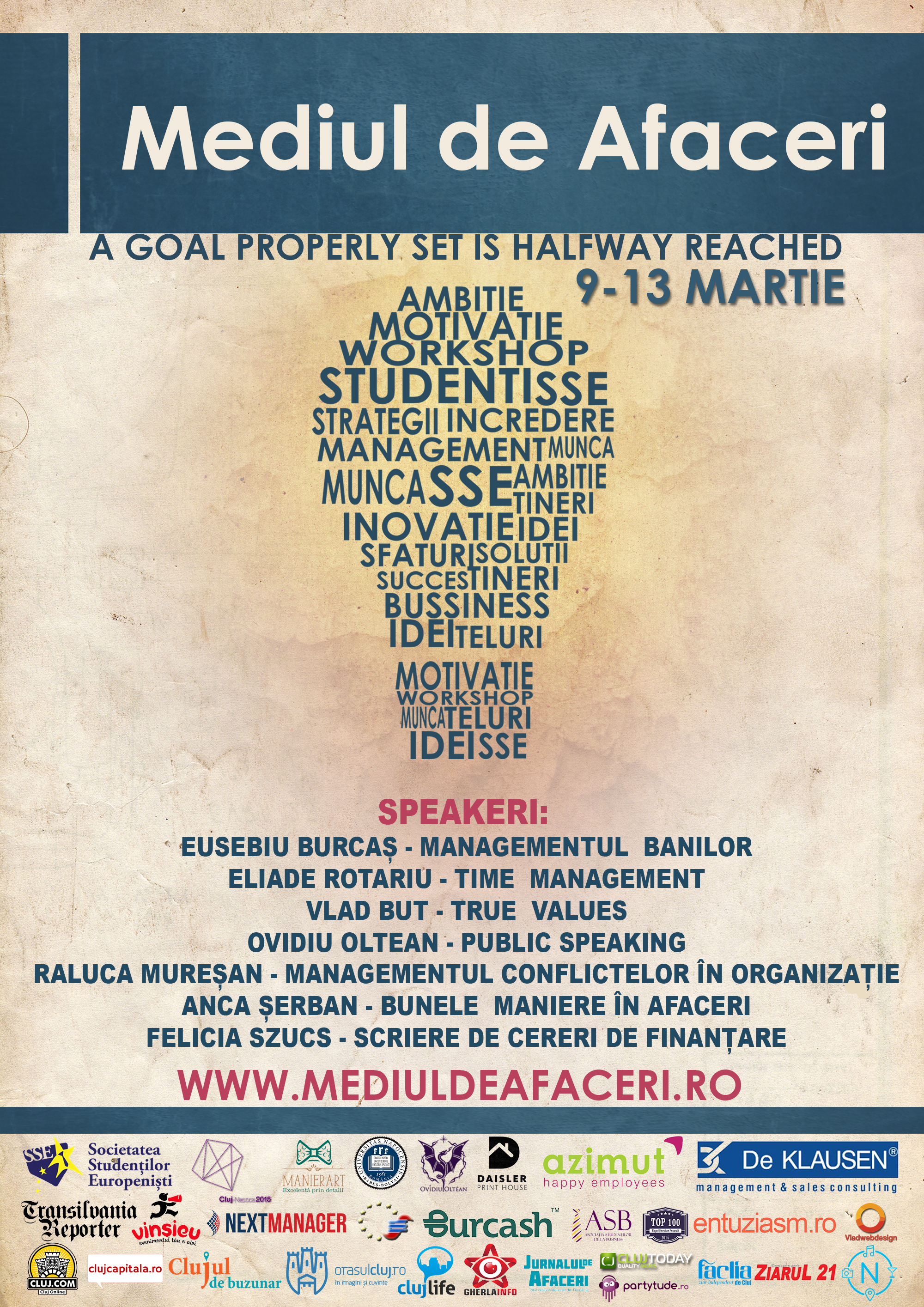 În perioada 9-13 martie, Societatea Studenților Europeniști organizează Mediul de Afaceri, un proiect făcut de studenți pentru studenți si se adreseaza studenților(la nivel licență sau master)  interesați de sfera business-ului precum și a oportunităților de carieră pe care un proaspăt absolvent le poate explora.