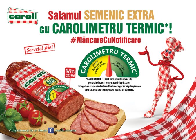 Asa ca am un mare noroc cu cei de la Caroli care au inventat o eticheta inteligenta cu cadran termosensibil numita Carolimetrul termic si au amplasat-o pe salamul nostru preferat: Semenic Extra(pentru ca e facut din 90% carne).