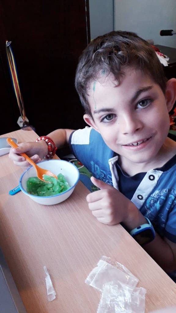 -3 cutii cu slime-uri de diverse culori pe care trebuie sa-l prepare singur(pe cel verde deja l-am dat gata)