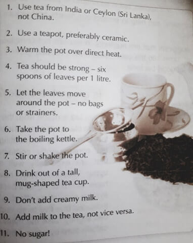 Reteta: Folositi ceai Indian nu Chinezesc si neaparat un ibric din ceramica. Incalziti ibricul pe foc. Ceaiul trebuie sa fie tare. Adaugati 6 linguri de ceai la un litru de apa. Puneti frunzele de ceai in ibric nu in strecuratoare. Amestecati sau agitati vasul care fierbe. Turnati ceaiul intr-o ceasca de ceai inalta. Nu adaugati crema de lapte.