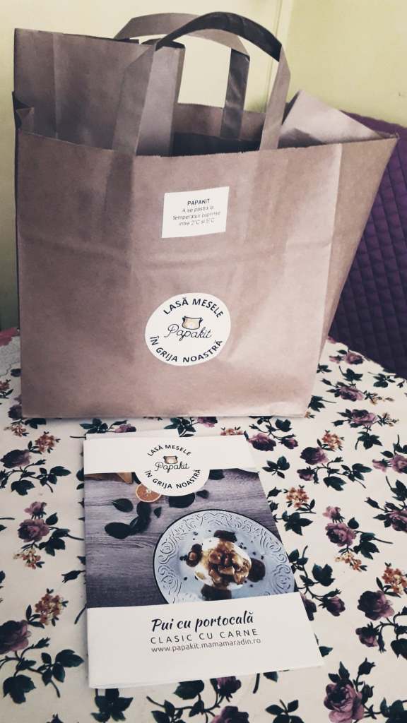 P.S. Papakitul il puteti comanda doar daca sunteti din Brasov. Puiul cu portocale e o reteta destul de exotica ca si gust(mie nici nu mi-a placut in totalitate, nici nu mi-a displacut). Acest concept se adreseaza celor care vor sa gateasca ceva repede si bun, fara sa faca drumuri la cumparaturi si fara sa stea sa portioneze ingredientele. Primesti acasa kitul cu produse si reteta pas cu pas.