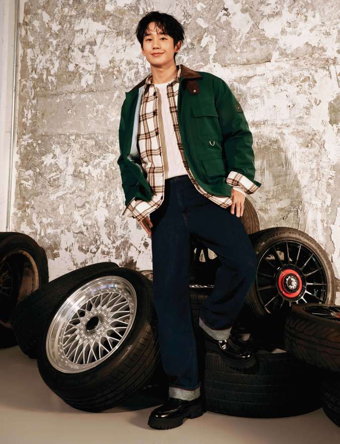 Jung Hae In reflecta spiritul colectiei intr-o garderoba care imbina rafinamentul cu farmecul relaxat. Camasile sunt reinterpretate in noi modele tartan, inclusiv intr-o nuanta calda de nisipiu si purtate sub o jacheta din piele de caprioara. Croiala este imbunatatita cu un palton lung din casmir bleumarin, in timp ce o vesta albastra din puf este purtata peste o camasa Oxford, alaturi de o cravata preppy, ca un omagiu adus traditiei universitare. Este o noua interpretare a garderobei moderne traditionale, care rastoarna traditiile stilului preppy cu radacini in New York prin twist-ul caracteristic Tommy.